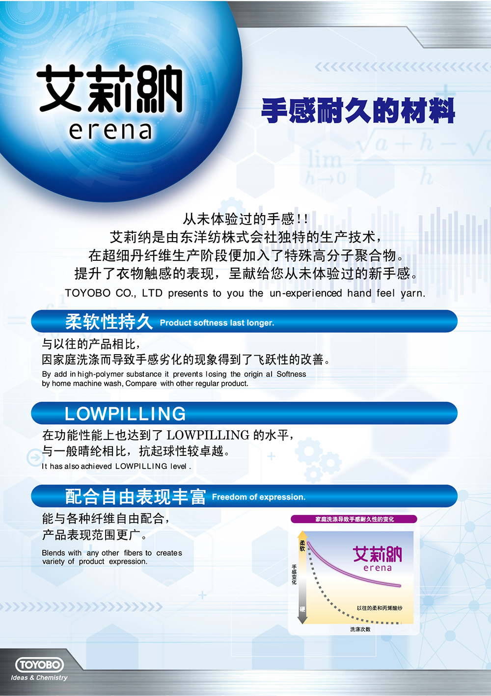 艾莉納是由東洋紡株式會社獨特的生產技術,在超細旦纖維生產階段便加入了特殊高分子聚合物,與一般腈綸相比,抗起球性較卓越。